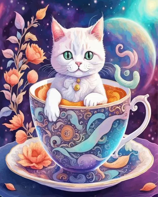 White Cat In A Cup Diamond Painting